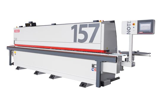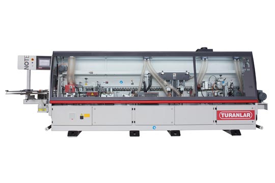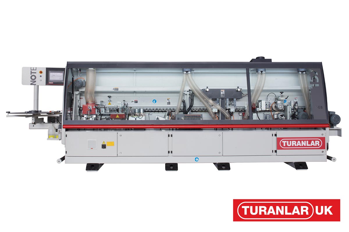 The T-EB-157 is one of the professional series of edgebanders manufactured by Turanlar. The T-EB-157 performs perfectly with its standard units i.e. PLC Touch Screen, Pre-Milling, Top and Bottom Trimming units, Radius Scraping and Buffing processes as well as our Teflon coated EVA Hotmelt glue pot system found on the majority of the Turanlar UK Edgebander range. In addition with the T-EB-157 you have hot air blower units and a grooving saw as well as Anti-adhesive spray which is done before the pre-milling. It can apply all common edging materials between 0.4-3mm (PVC, Veneer, ABS, Melamine & Solid Wood etc.) all up to 50mm wide panels. It has a feeding speed of 15m/min.