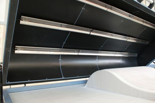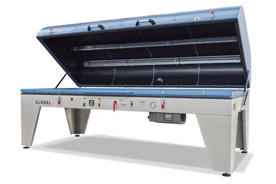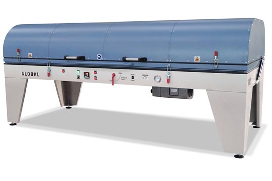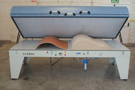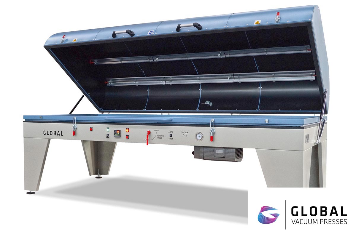 The Global Heated Vacuum press -Standard (HVP-S) is a robust vacuum membrane press with heating station that is specially designed to accelerate the cure time during the veneering and laminating process. The heating hood of the vacuum press heats up to 80°C and offers ideal characteristics to work with white glue (PVAc) and PU adhesives. The temperature can be adjusted by a temperature control unit. For more information please contact us.